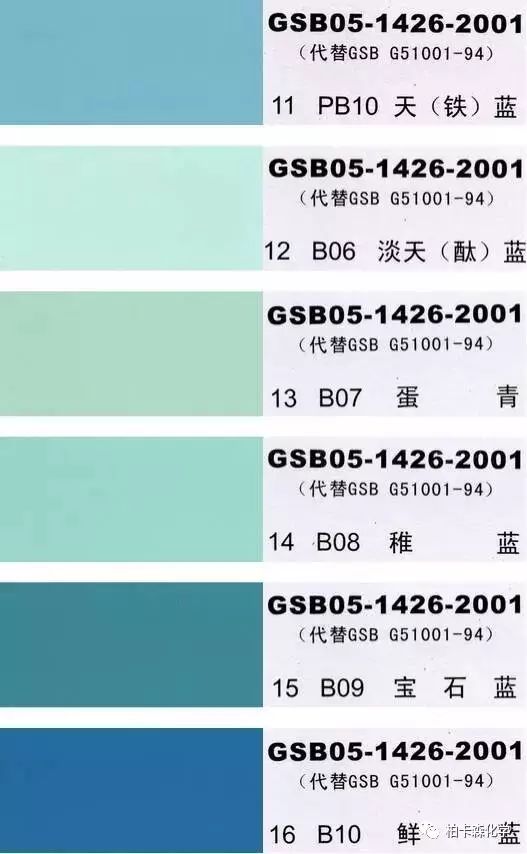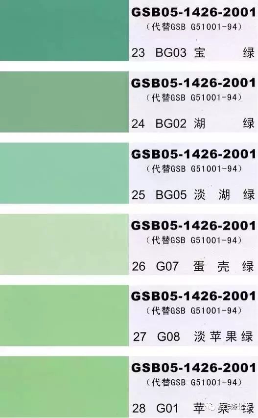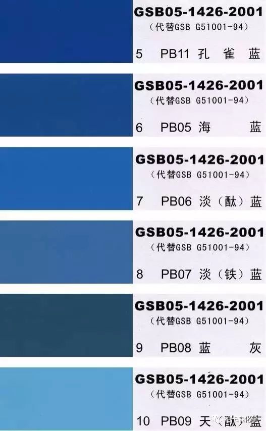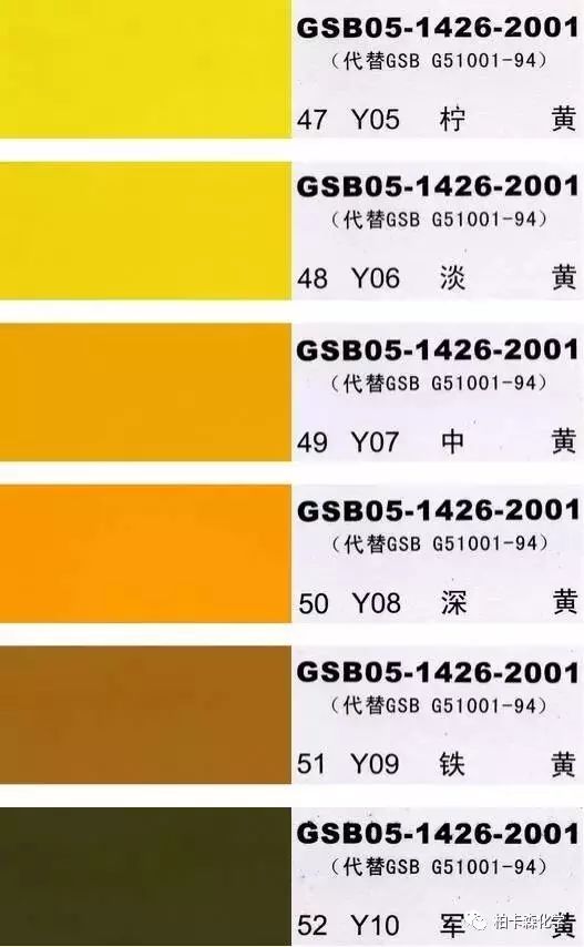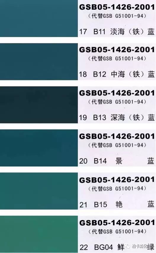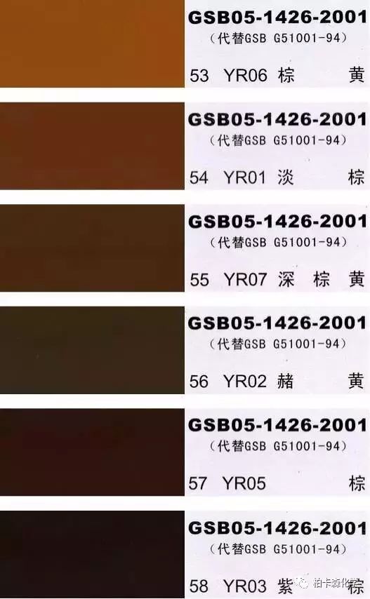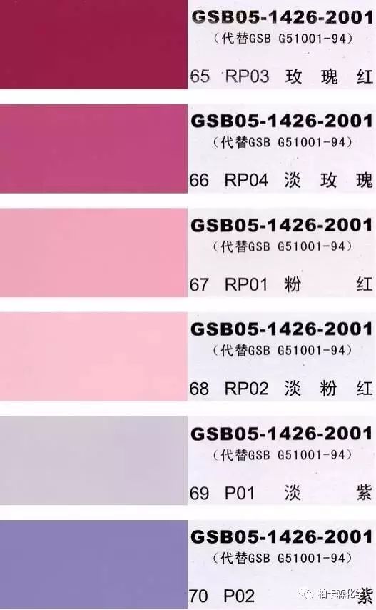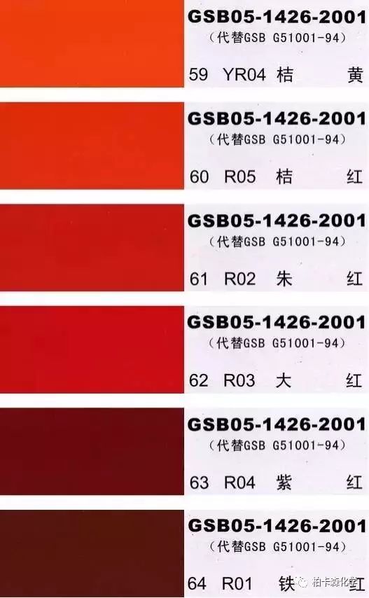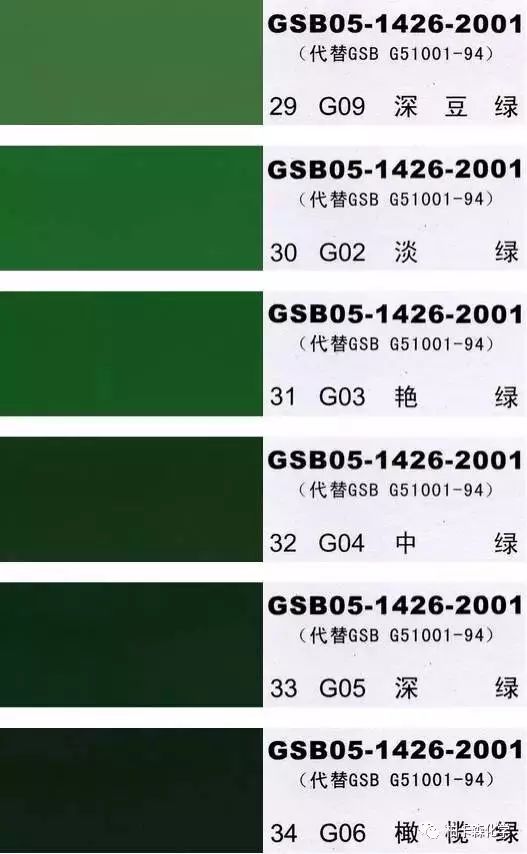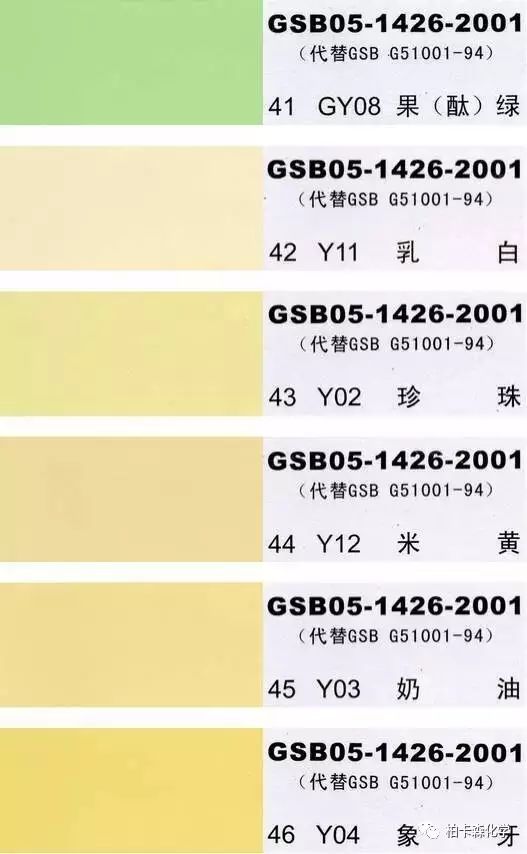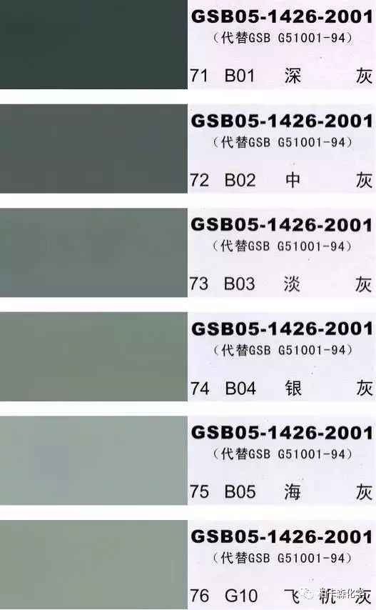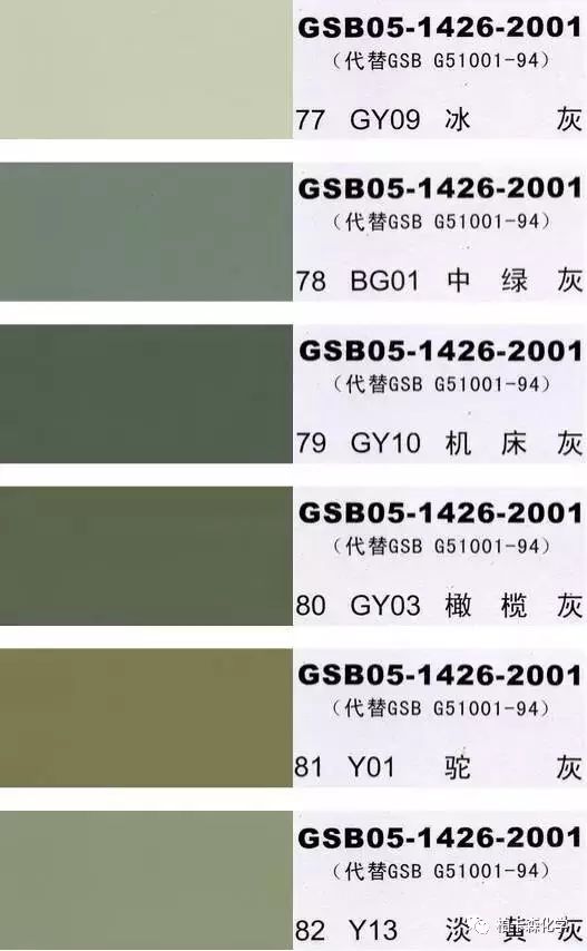 GSB05-1426-2001;全國涂料和顏料標準化技術(shù)委員會(huì )修訂,含83種顏色,光面效果。每個(gè)顏色都有國家統一標準的編號,適用于油性涂料方面使用。
